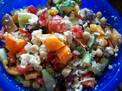 Ingredients: Fresh sweet bell peppers, English cucumber, sweet onion, black olives, garbanzo beans, Asiago cheese, and black pepper.